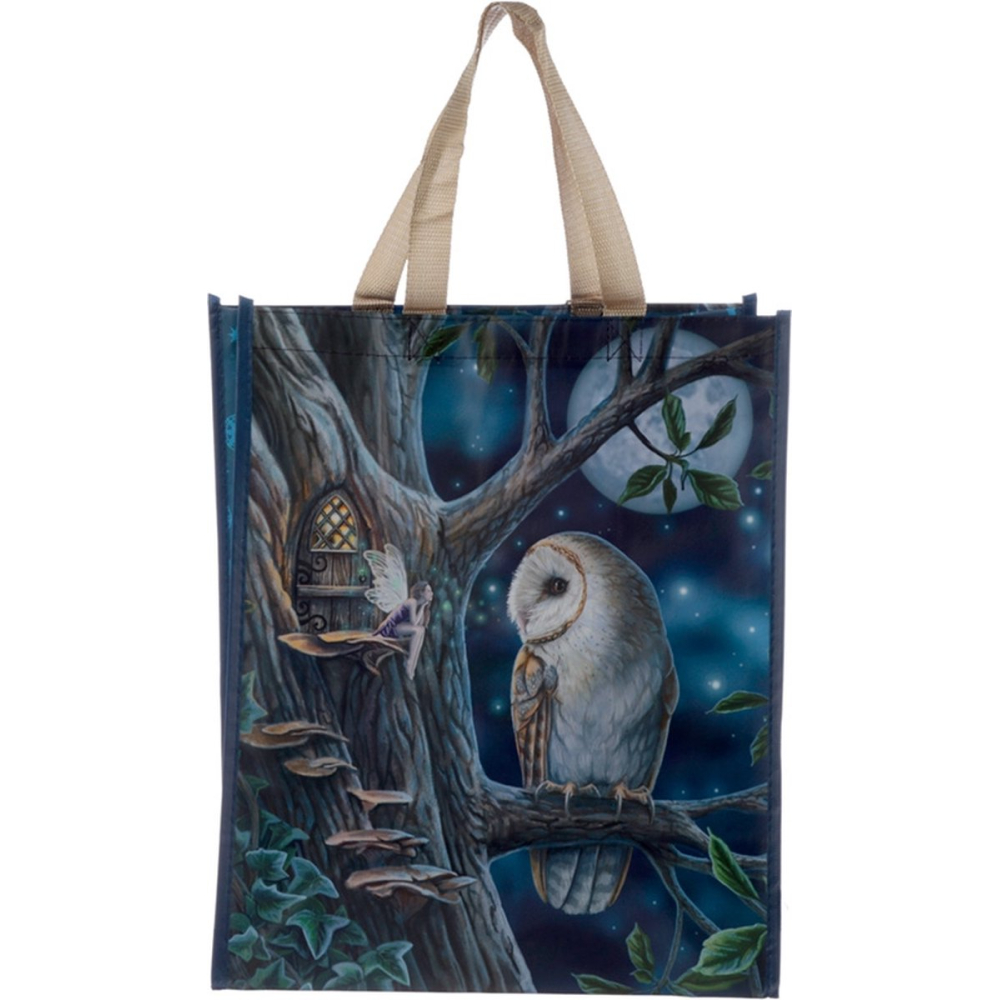 Boodschappentas met de afbeelding een uil en een fee. In deze big shopper kun je alles kwijt. Handig voor op vakantie, met de boodschappen etc. Afmetingen: 33x40x18(HxBxD) Materiaal:Gelamineerd Polypropyleen