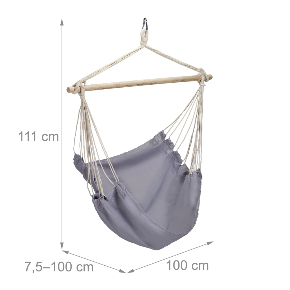 Deze hangstoel is het ideale accessoire voor het warme seizoen. Of tijdens het lezen van je boek in de tuin of bij een ontspannen uitstapje met je gezin in het park, de hangstoel van katoen kan overal mee naartoe genomen worden. Ook in de woonkamer is de hangmatstoel geweldig. Hij ziet er niet alleen heel mooi uit, maar draagt ook nog eens bij aan de gezelligheid. Met behulp van de karabijnhaak kun je de kinderhangstoel aan het plafond of een frame ophangen.Opmerking: Zorg ervoor dat je de schommelstoel met de haak aan vaste objecten bevestigt en er ook heel stevig aan vastmaakt.