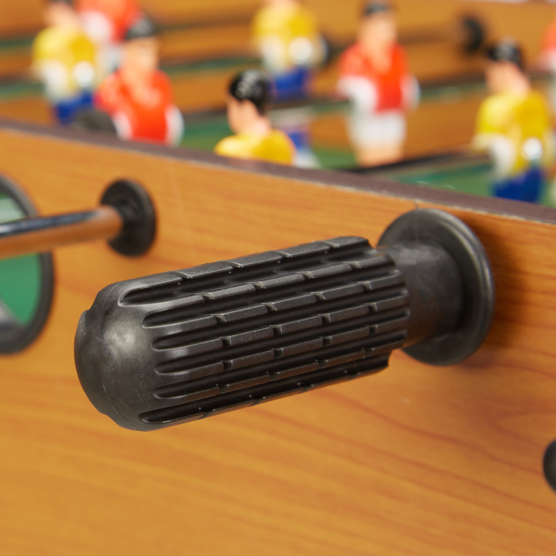 Grote en kleine voetbalfans zullen blij zijn met deze tafelvoetbaltafel! De compacte kickertafel heeft in totaal 6 stangen, waar aan elke stang 3 spelers vastzitten. Elke speler bedient in totaal 3 stangen en probeert door middel van draaien, schuiven en trekken de bal in het doel te schieten. De gescoorde doelpunten worden handmatig op twee scoreborden weergegeven. De tafelvoetbaltafel is gemaakt van stevig MDF in hout look en staat stabiel op 4 poten.